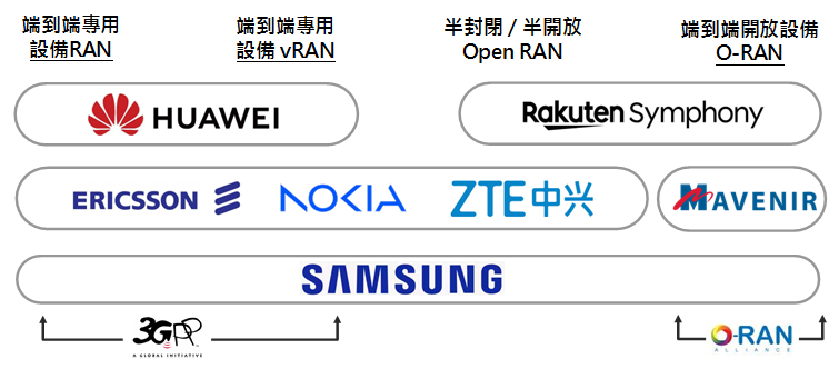 至于「端到端开放O-RAN」则是诉求完全开放性、多元供应商的概念,理论上只要在符合O-RAN联盟(O-RAN Alliance)的标准(如Open Testing Integration Center;OTIC)下即可互通互连,代表性的供应商包括三星、Rakuten Symphony、Mavenir等。