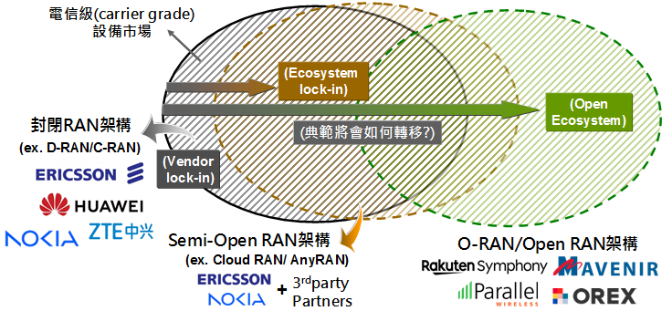值得注意的是,RAN从封闭式走向开放式架构,对白牌业者而言,似有成为电信级(carrier grade)供应商的机会,但若是「单一供应商旗下的Ecosystem Lock-in」模式成为开放式RAN市场主流,则未来恐怕还是会由传统的少数电信设备供应商主导新市场。