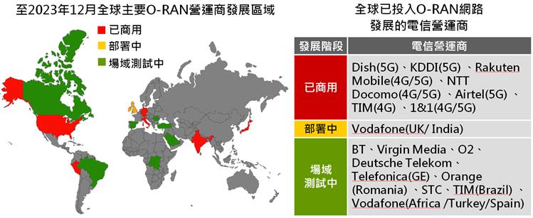 值得注意的是,O-RAN联盟自2018年成立至今已5年,且距首个5G網絡开臺也逾4年,但据O-RAN联盟至2023年12月的统计,全球采用O-RAN标准并已实际投入商用的电信营运商数量并不多,主要集中于日本(3家)、欧洲(2家)、印度与美国(各1家)。若将统计条件扩大至「部署中」与「场域测试中」,则有9家欧洲的運營商参与,其他4家业者分布在南美洲、非洲、亚洲(含中东)等地区。