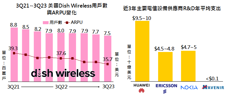 观察Dish Wireless自2021年第3季至2023年第3季用户数与ARPU (Average Revenue Per User)变化,可发现两大关键指标在过去2年不增反减,用户数自880万减至750万;ARPU从39.3美元一路下滑至35.7美元,说明Dish Wireless并无法撼动既有移動市场版图。