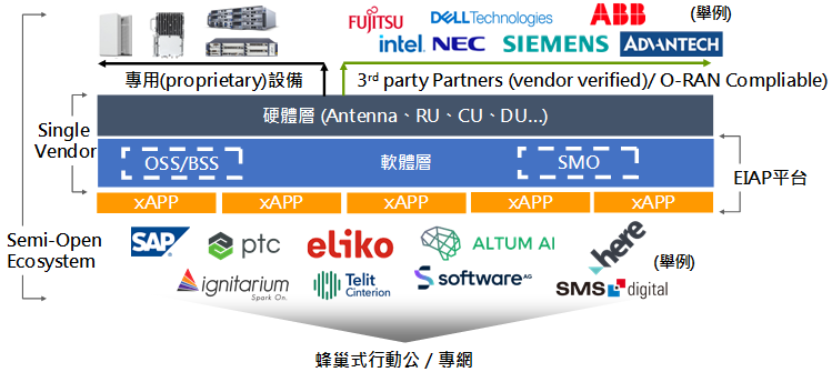 在「端到端专用设备vRAN」方案的右边是「半开放/半封闭的Open RAN」,顾名思义该方案虽采用开放式RAN架构,允许接入第三方业者的網絡设备或軟件,但并非随插即用(plug and play),只有特定第三方业者得以接入,包括新兴业者Rakuten Symphony、传统设备商诺基亚、爱立信等均有发展此种类型的網絡部署方案。