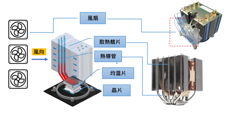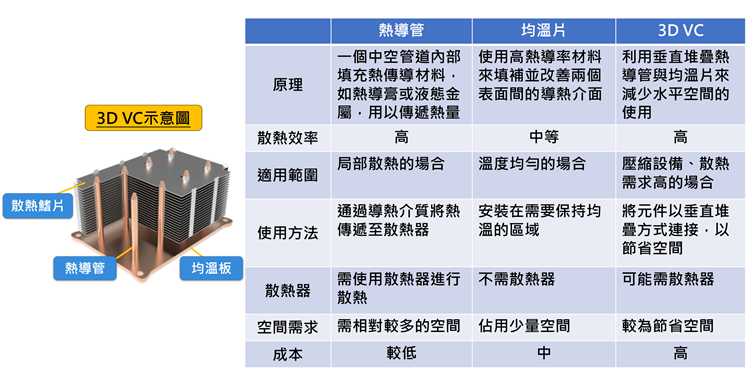 热导管与均温板在气冷散热中属于风扇以外的重要材料元件,以往在气冷散热设计上,两材料都是可分别部署至芯片上或系统中,与风扇结合成为散热系统进行散热运作,其中,热导管较均温板所占空间较多,设计上也会需要较大的空间。