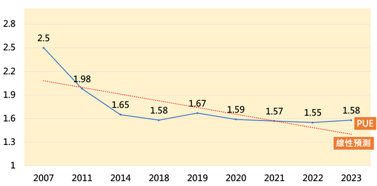 DIGITIMES Research观察,2023年全球數據中心平均PUE为1.58,而中系业者也因中国政府提出规定业者须于2025年數據中心PUE至少要达到1.3的水准政策驱动下,中国數據中心近年平均PUE已较2007年相比下降幅度高达60%,透过线性预测也可推论未来PUE呈现下降趋势。