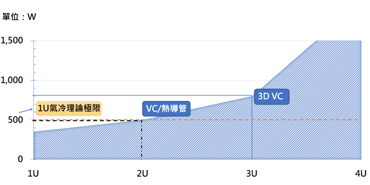 然而,在3D VC提升气冷散热极限的优势下,其垂直堆叠设计也为服務器的高度带来一定限制,因垂直堆叠模塊化设计,导致服務器需要有一定的高度才能灵活运用3D VC在气冷散热上的配置。