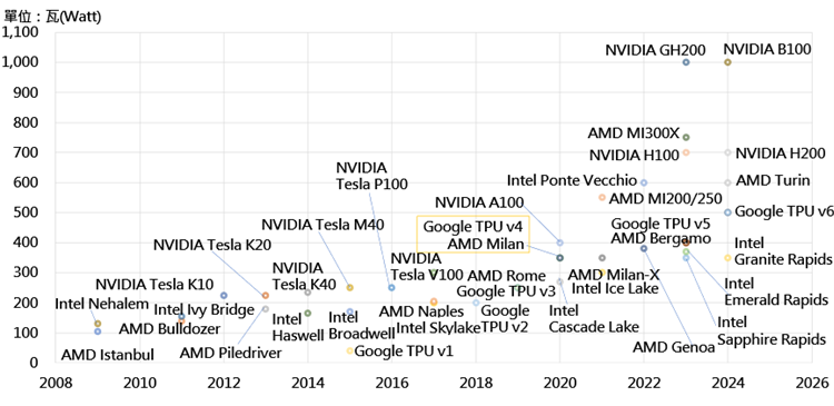 在运算成长趋势下,數據中心的发展路径不再仅仅受到降低PUE数值目标的引领,还受到生成式AI和高效能运算的共同牵引,及耗用能源上的担忧,特别是在HPC和AI的快速崛起与生成式AI的推动下,CPU和GPU效能成长也面临热设计功率(Thermal Design Power;TDP)的不断提升,将为散热带来更为严峻的考验。