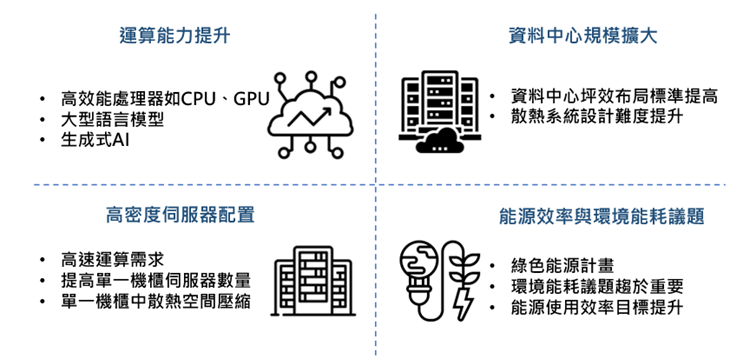 新時代數據中心建置以及对环境友好和节能效益的追求,使PUE成为评估數據中心运行效能的重要标准。与此同时,生成式AI的发展则带动數據中心内运算工作负载的大量增加。趋势共同作用下,數據中心业者对散热需求表现强烈。