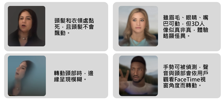 再者,使用者扫描脸部建立的Persona虚拟头像,3D头像虽可挑眉、眨眼、微笑、卷舌,脸部动态细节多,但头发不会飘动,且会和衣服相黏,当头部左右晃动时,侧面的头发也被刻意模糊不显示,呈现略死板,效果还在恐怖谷(Uncanny Valley)阶段。