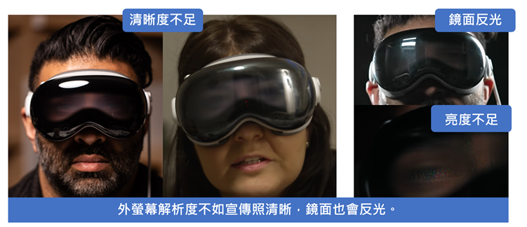 外屏幕透视人脸功能EyeSight在苹果官方宣传影片中显示清晰,然实际体验并非如此,不仅外屏幕显示器会反光,显示分辨率也有待加强,要清楚观看Vision Pro配戴者的表情相当困难。