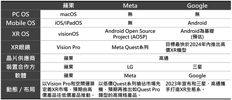 苹果、Meta、Google等美系三大业者皆布局消费型VR/MR市场,苹果除拥有多操作系統优势外,芯片、装置、軟件均自行设计,在软硬件兼容性、开发迭代速度上,更具优势。