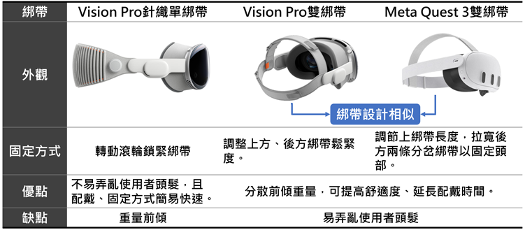 Vision Pro双绑带的设计和Meta Quest 3出厂绑带相似,都借由上绑带调整重心,不同处在于Vision Pro上绑带为横向,另外,Meta Quest 3后绑带采分岔设计,Vision Pro双绑带的后方则仅有一条绑带。