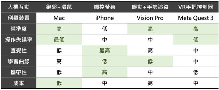Vision Pro眼动与手势追踪的人机互动组合除操作直觉外,精准度让国外使用者在初次体验时,如感到拥有超能力(super power),比起普遍XR眼镜以控制器或准心瞄准按钮,眼动与手势追踪能大幅缩短操作时间,但在操作失误率方面,尚高于鼠標与触控,在多次操作失败后,容易感到疲惫。
