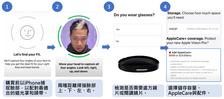 苹果为确保每位使用者都能舒适配戴Vision Pro,从购买Vision Pro第一步,即须借由具Face ID的iPhone/iPad以两种远近距离扫描头部上、下、左、右,判断适合使用者头型大小的的遮光罩和头带。