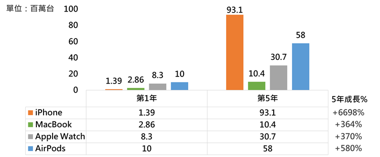 观察过去苹果产品iPhone、MacBook、Apple Watch、AirPods自产品第一代上市后,前5年出货量均成长,第2年出货量分别成长737%、43%、43%、100%,至第5年出货量达第1年的67倍、3.6倍、3.7倍、5.8倍,均可看出苹果优化产品迅速;此外,过去苹果也在各装置持续推出如SE、Air、Max、Pro、Ultra、Max等不同版本,满足不同需求与预算的消费者,增加销量。
