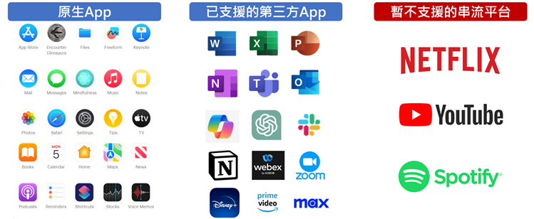 Vision Pro支持的生产力App除苹果的Keynote外,也支持Microsoft 365的Word、Power Point、Excel,并支持协作軟件Slack、笔记軟件Notion、视讯軟件Webex、Zoom,也支持Open AI的ChatGPT。就生产力而言,Vision Pro已获多数热门App支持。