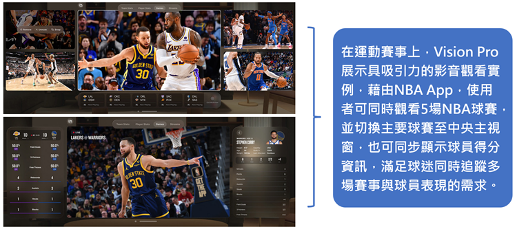 在影音娱乐上,Netflix、YouTube与Spotify三大串流平臺暂不推出visionOS专属App,据The Verge记者体验,甚至YouTube上的VR影片也无法在Vision Pro上播放;不过,YouTube发言人已表示visionOS的YouTube App已排入产品路线图,依Vision Pro的热潮,若非战略考量,串流平臺应迟早会支持Vision Pro。现阶段Vision Pro支持使用者基数较大的串流服务为Disney+,订户数约1.5亿,另外,使用Vision Pro观看如NBA等体育赛事上,也有不错的体验。