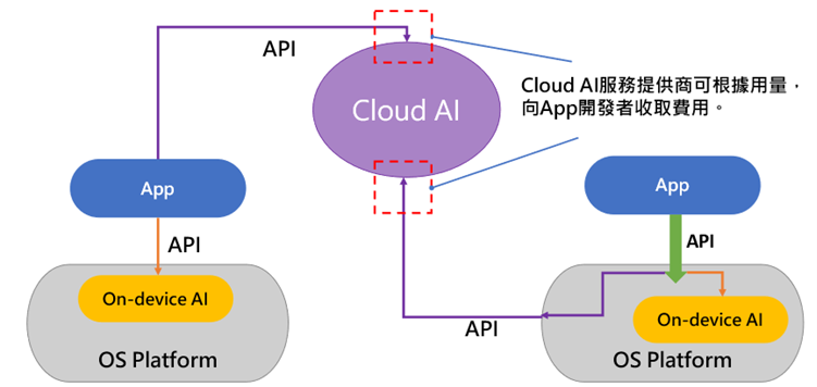 再者,从商业模式来看,纯装置端LLM及生成式AI应用较不易向使用者收费,而且LLM及生成式AI应用展现的品质及准确性,时常与其后端连接的专业性數據库息息相关,对于专业數據库提供者来说,偏好透过云端AI提供用户服务,而非把數據库卖断给客户安装在用户装置上。
