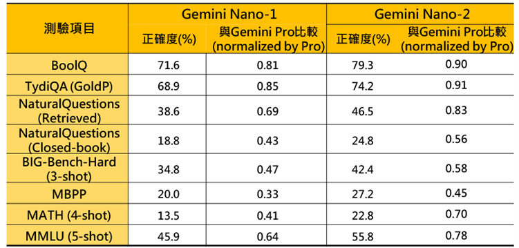 以Google所公布的数据来看,与Gemini Pro相较,在不同领域测验的答题正确率,18亿个参数的Gemini Nano-1最差只剩Gemini Pro的约3成能力;参数量32.5亿个的Gemini Nano-2最差则尚有Gemini Pro的约4成5能力。
