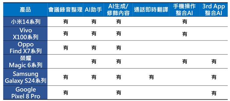 整理比较小米、vivo、OPPO、荣耀及三星近期上市的装置端生成式AI手机,相关功能共同诉求点不外乎类似ChatGPT的问答AI助手及以图片为主的AI生成或修饰内容。另外,大多数业者也都推出考量用户隐私及數據机敏性,特别适合由装置端生成式AI处理的应用,如把会议录音生成文稿与摘要的整理功能。