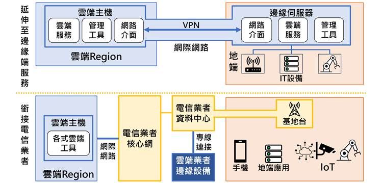 因应5G、边缘运算时代来临,云端业者亦与運營商合作,云端业者边缘设备可与电信數據中心专线连接或共置一地,运用电信级網絡整合云端服务,达到低延迟高品质的合作综效。