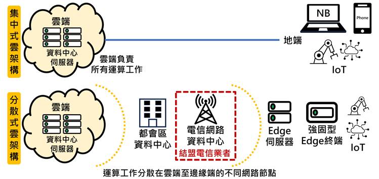 以往集中式云端網絡由云端业者主导數據中心建置地点,云端服务透过互聯網提供全球用户,另外,超大型數據中心主要负责云端服务和AI运算工作。