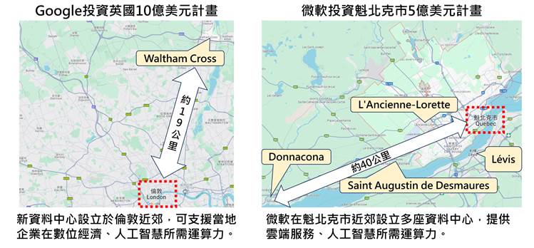 Google投资英国的新計劃将在邻近伦敦都会区约19公里的Waltham Cross建设新數據中心;而微软(Microsoft)则在加拿大魁北克市区周边布建4座新數據中心。