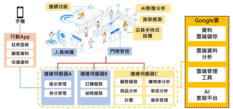 以智能零售(smart retail)为例,Google基于分散式云架构提供无人商店解决方案。商店内设置搭载虚拟化运算丛集的边缘服務器,可在商店端實時进行客户數據确认、物联网數據搜集、商店门禁管理、购物和计价分析和商店库存管理等多方面功能,此外,可将经分析后、无隐私疑虑的數據上传云端,结合云端平臺完整服务进行大数据管理和深入分析。