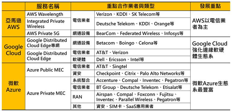 三、指标云端业者彼此发展重心略有差异,其中微软Azure具有最广泛的合作厂商生态系,如Azure Private MEC方案弹性大,方案可结合众多合作厂商产品,进而大幅提升服务定制化能力。