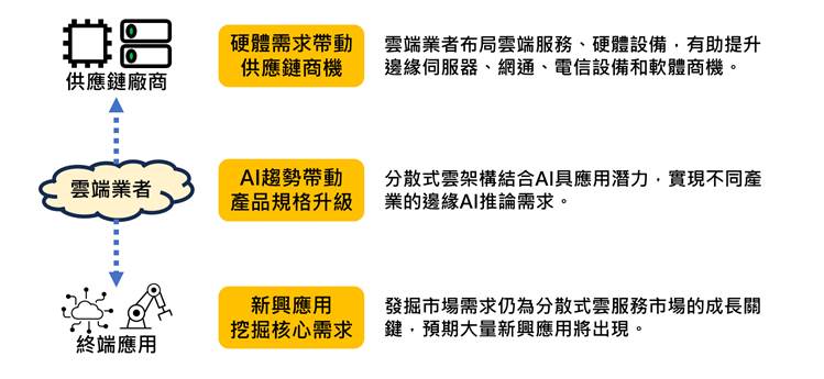分散式云服务可将云端服务延伸至地端,并结合边缘运算软硬件,不仅可扩张云端服务市场,且提升边缘运算软硬件需求,同时云端业者亦可切入边缘运算市场,甚至主导边缘运算发展方向。另外,分散式云架构可衔接既有云端软硬件供应链,而产业數字转型需求、5G、AI (Artificial Intelligence)/ ML (Machine Learning)和边缘运算需求加剧,分散式云市场成为既有云端供应链业者值得关注的新战线。