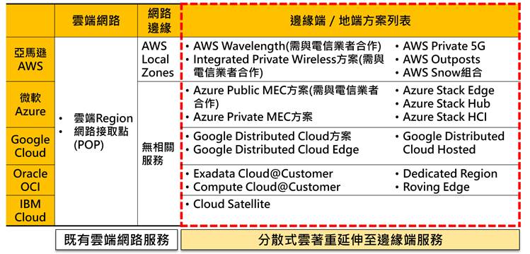 云端业者逐步由原本集中式云架构转型为分散式云,并基于分散式运算和混合云概念,云端业者纷纷推出分散式云产品组合,以实现提升云端服务品质,同时维持云端服务的稳定性、产业需求与政策规范等多重诉求。