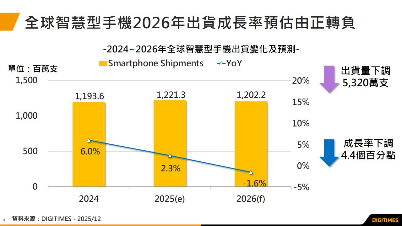 因存储器价格大涨 2026年全球智能手机出货成长率预估由正转负