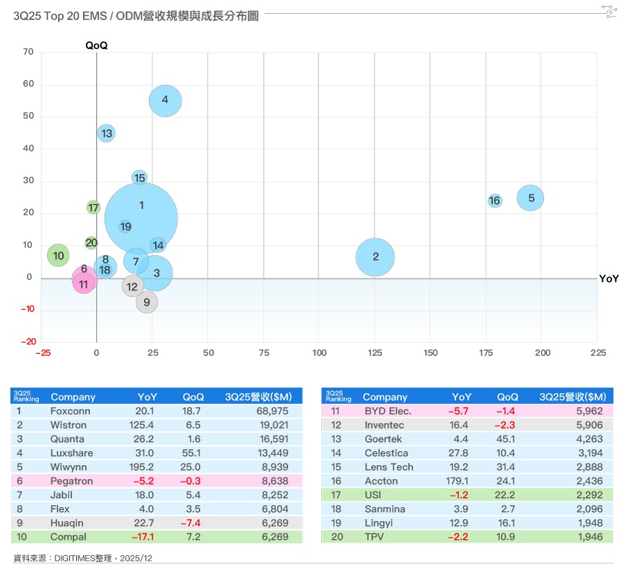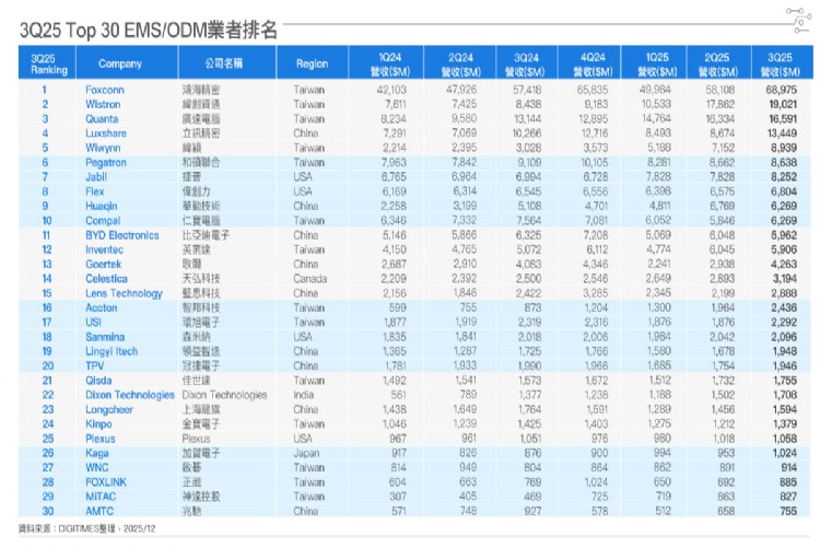 (3Q25全球20大EMS/ODM排名)AI持续主导营收成长与排名变动