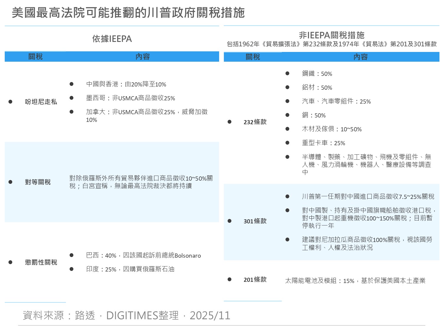 美国总统川普(Donald Trump)第二任期上任至今,在内政或外交上频频发狠话,签署大量有争议的行政命令,然而10月底在APEC和中国国家主席习近平见面后,为促成史上最大的贸易协议,做了许多让步,部分对中国 美国最高法院审理川普关税合法性 哪些措施恐遭推翻?