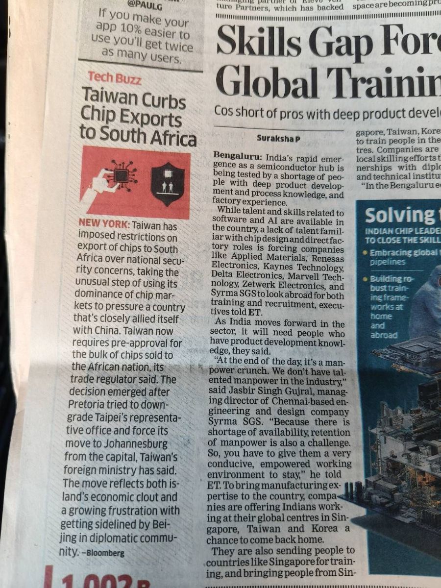 另外值得一提的是,经济部23日公告暂停核发47项半导体相关货品输出南非的许可,但25日又发出声明,称决定暂停该预告,外交部补充说明,此举是因应南非政府的协商请求。其实此事最值得观察的是,国际媒体对此一宣布大肆宣扬,包括本周在印度采访的DIGITIMES记者庄衍松,也拍了当地报纸给我看,显示台湾芯片外交的效应不可小觑。