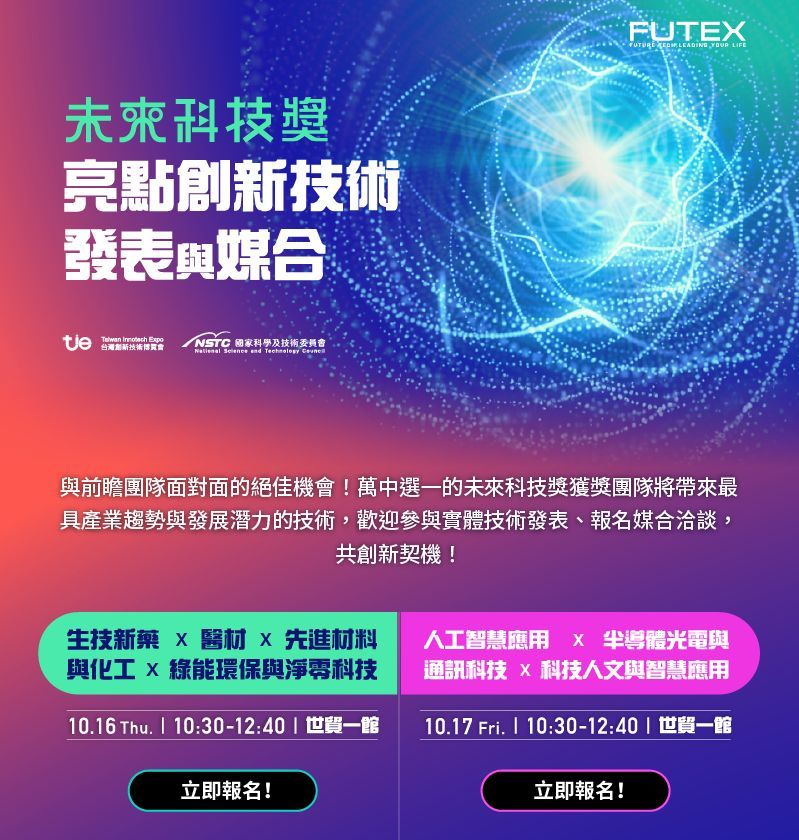 未来科技馆诚挚邀请产业界、学研单位与投资人把握10月16日与17日上午10:30–12:40,台北世贸一馆的双日活动。现场不仅能掌握最新科研突破,更能透过媒合洽谈,共同推动创新成果落地,携手开启智能与永续的新篇章。