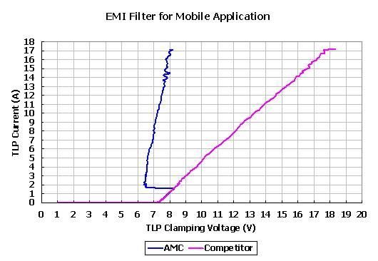 当静电放电事件(ESD event)发生时,暂态电压抑制器的箝位电压愈低,则愈能适时地导通可观的静电放电电流,以提供受保护电路免于遭受静电放电的侵害而永久受损失效。图2所示,即为利用传输线触波产生系统(transmission line pulsing system;TLP system)所量得的箝位电压比较图表。由图表中可以清楚看到,晶焱科技(AMC)所开发应用于手持式装置的电磁干扰滤波器,在17安培 (ampere;A)的高静电放电电流下,其箝位电压低于相似产品约有10V左右,可以非常有效地提供受保护电路1个快速有效的静电放电旁代理径 (bypass path)。