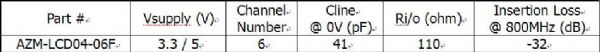 表1所列,为晶焱科技此一电磁干扰滤波器产品的基本特性参数数值。其适用于5V以下的额定电压电路系统,线电容(line capacitor;Cline) 值约为41微微法拉 (pico farad;pF),操作频率在800万赫兹(megahertz;MHz) 时,其插入损耗(insertion loss)可达 -32dB,可以显着地降低电磁干扰信号,以维持受保护电路的操作功能正常。