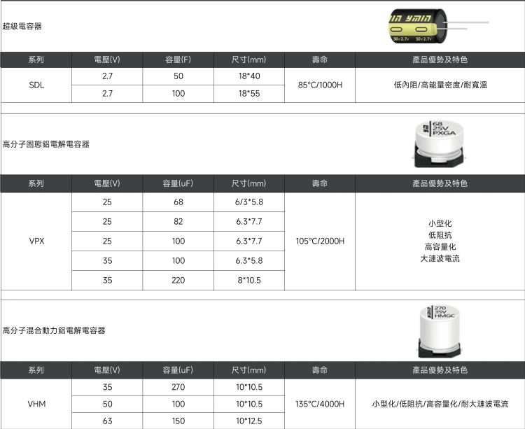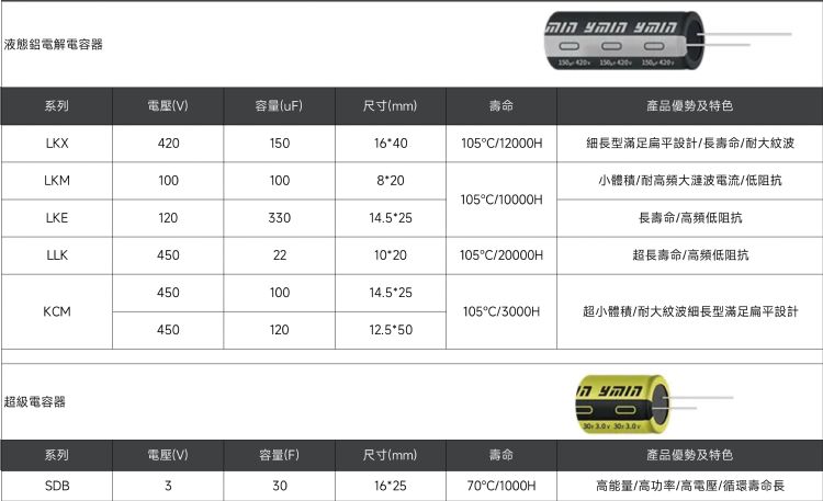 1. 液态铝电解电容器:永铭KCM系列(450V,120μF)具备细长设计(12.5×50mm),利于模块扁平化布局;同时在高温、高负载环境下仍具长寿命与耐大纹波特性,降低维护成本并提升可靠性。2. 超级电容器:提供高能量与大功率支持,能在起飞或加速时快速释放能量,同时具备高电压兼容性与长循环寿命,有助于延长飞行续航。