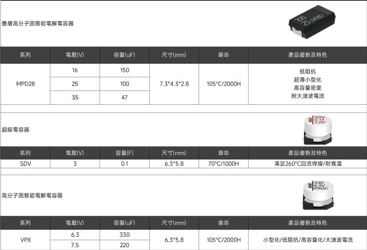 飞控系统是无人机的「大脑」,其稳定性高度依赖电容器性能。包含下列特点:1. 叠层高分子固态铝电解电容器:超薄小型化设计降低重量,高容量密度与耐大纹波能力则有助于抑制干扰,提升飞行精准度。2. 超级电容器:作为RTC备用电源,能在电压波动或瞬断时维持芯片稳定运作,支持260°C回流焊并具备耐宽温特性。3. 高分子固态铝电解电容器:低阻抗与高容量密度,确保在高频应用下电流输送稳定,进一步保障系统效能。