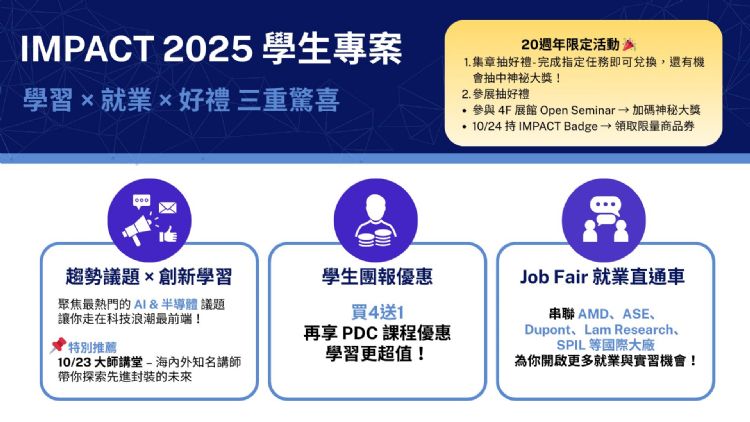 走过20个年头,IMPACT一路以来秉持「推动全球封装与PCB产学先进技术国际交流平台」初衷,见证了台湾半导体与PCB产业的荣耀时刻。有感人才力即国力的重要性,2025年20周年更特别推出「学生专属三重惊喜」,扩大邀请青年学子在盛会中认识产业前景。
