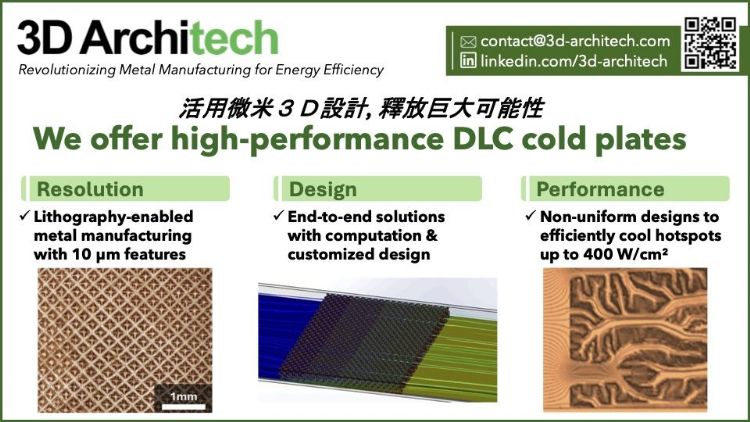 公司技术可有效应对因AI与云端需求增加而日益严峻的数据中心能源挑战,相较传统方式最高可提升40%冷却效率。采用金属3D打印技术打造的微流道结构,兼具优异冷却效能与节能效果,是其显着特色。