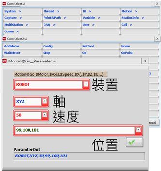 MVCon No-Code选单让使用者以Motion@Go指令,选择控制的机械手臂(或滑台)、运动轴、设定速度、位置即可驱动机械手臂。双数工控
