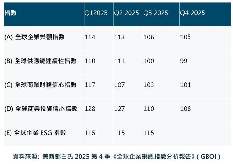 2025年第4季全球企业乐观指数跌幅趋缓,大型企业在供应链重组与市场多元化方面展现出更高的调整能力,信心指数季增3.2%,成为支撑整体稳定的关键力量。