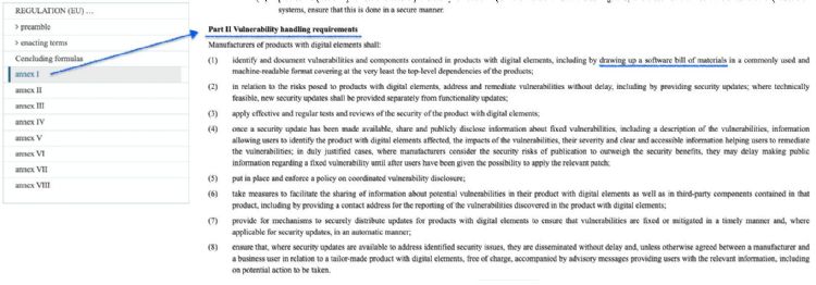 1. 法规依据:CRA附件一的强制要求:根据CRA附件一(Annex I)Part 2针对「漏洞处理(Vulnerability handling)」的基本要求,制造商必须识别并记录产品中包含的漏洞与组件,其中明文规定必须「建立并维护机器可读的软件物料清单(SBOM)」。这不再是加分项目,而是必考题。
