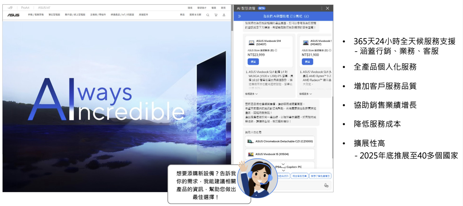 华硕导入Azure OpenAI Service、Azure AI Search、Azure API Management等微软核心技术,让AI Agent能实时回应产品规格、保固与行销优惠等复杂查询,大幅提升信息服务的效率与准确度。