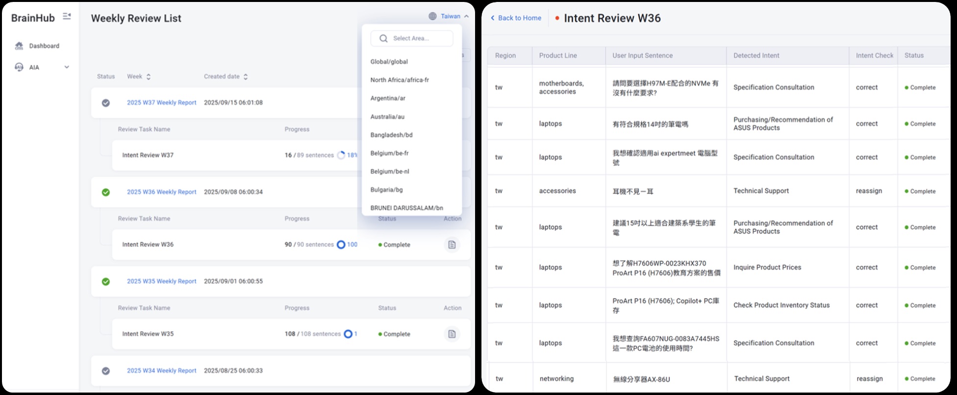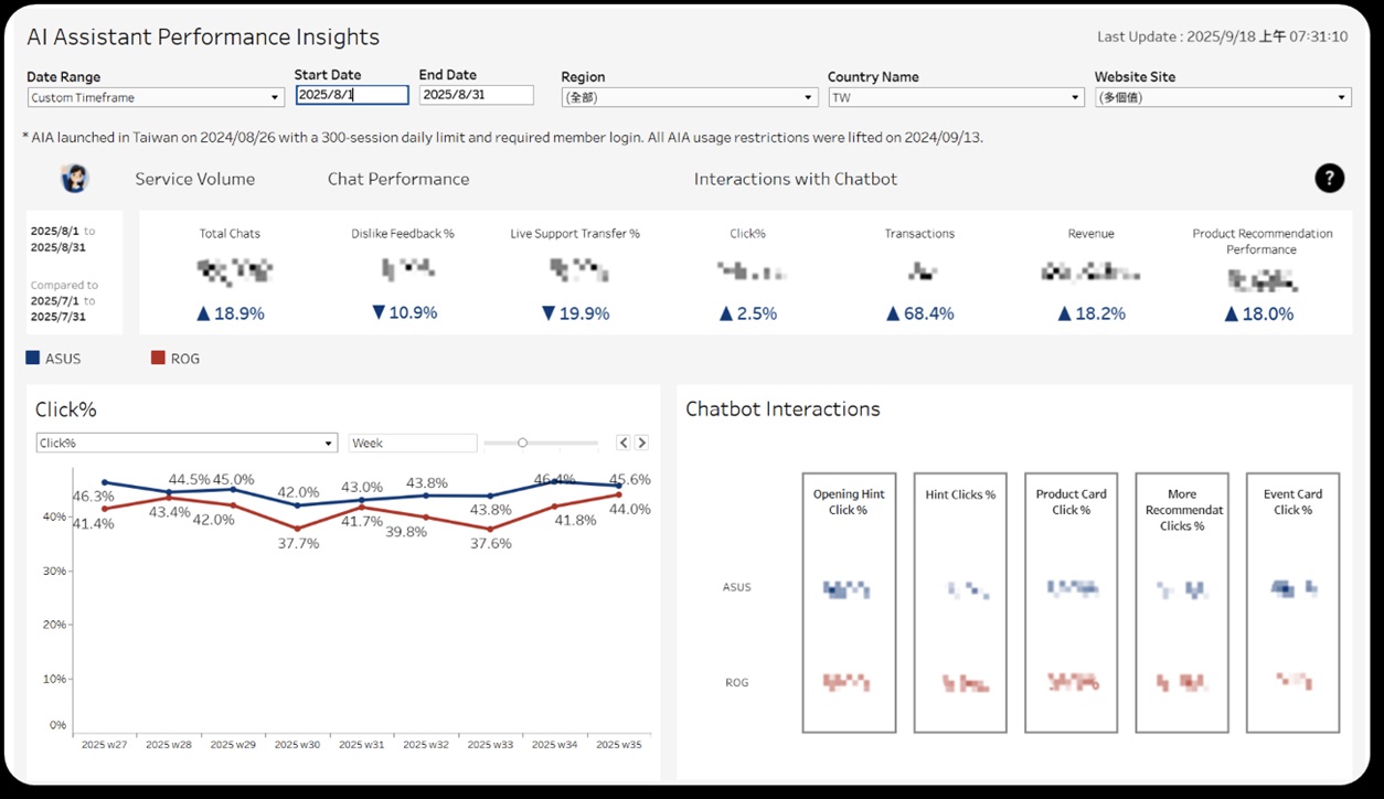 为确保服务品质一致,华硕自主开发BrainHub知识管理平台,自动更新知识数据,支持全球在地化知识管理,也自建实时AI绩效监控仪表板,确保跨国服务的稳定与准确。