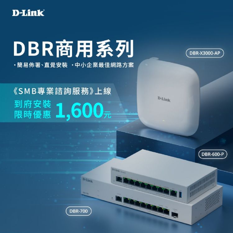 全新的DBR系列包含DBR-600-P与DBR-700企业级智能有线路由器,以及DBR-X3000-AP无线基站。此系列特别针对100人以下的中小企业环境设计,适用于新创公司、零售门市、办公室与教育机构。