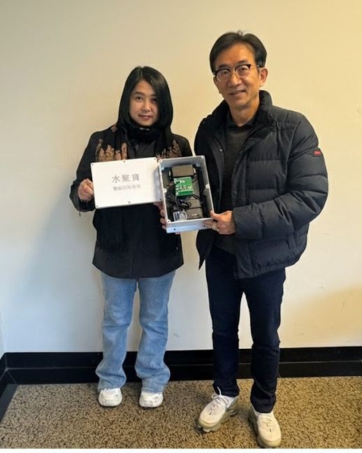 宽纬科技总经理蔡政勳(右)与副总经理陈秝旗(左)与水聚宝智能水质监测设备合影,展示明纬电源在水聚宝系统中的关键支持角色。明纬