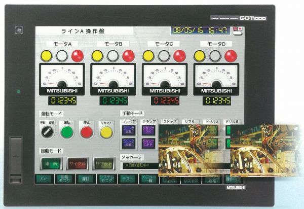 GT16系列则是因应现场网络化需求与周边装置应用的强化,除有超越 GT12 系列的功能规格外,网络应用与多媒体功能支持更是突出,强大的影像处理界面(GT16M-MMR)加装后,可对应BNC型态的摄影机进行录影监视,分为VGA与QVGA格式,便利的功能有长时间的监控性录影( QVGA 320* 240影像最大约50小时)或设备异常的事件录影(发生异常前后共 4 分钟),现场人员如有程序修正维护需求,不需一般PC或NB,即能藉由GOT界面进行程序修正,亦可支持线上PLC重置(Reset)与运转中写入的功能。操作者常因现场资源有限,需于现场与办公室间常态的进出,现今GT16系列可利用Ethernet网络方式,直接在GOT界面上显示线上PC的桌面画面并可进行触控操作,大大节省时间与提升资源的效率。
