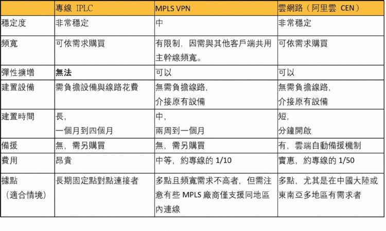 MPLS(Multi-Protocol Label Switching):适合多点、但单点带宽需求不高者,适合有预算考量者,但需注意连线品质较不稳定。云网络:近几年云端蓬勃发展,对应网络服务与基础设施逐渐成熟,加上云随开即用的特性,云网络方案特别适合加带宽、据点开拓等需弹性应用者。
