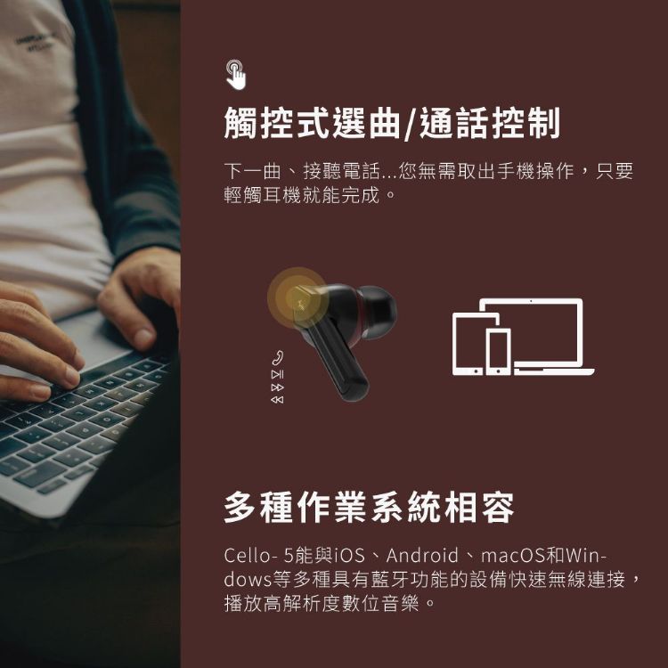 Avier AAL Cello-5能与Android、iOS及Windows等系统装置快速配对,人性化的直觉触控功能,让您在享受音乐的同时,也能轻松上手各项功能性操作。